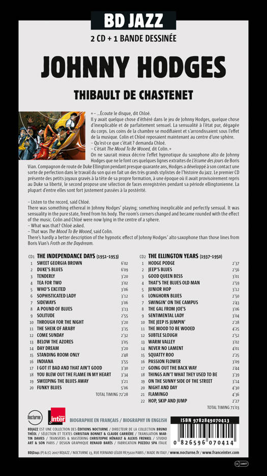 « - ...Ecoute le disque, dit Chloé.<br /> Il y avait quelque chose d’éthéré dans le jeu de<br /> Johnny Hodges, quelque chose d’inexplicable et de<br /> parfaitement sensuel. La sensualité à l’état pur,<br /> dégagée du corps. Les coins de la chambre se<br /> modifiaient et s’arrondissaient sous l’effet de la<br /> musique. Colin et Chloé reposaient maintenant au<br /> centre d’une sphère.<br /> - Qu’est-ce que c’était ? demanda Chloé.<br /> - C’était The Mood To Be Wooed, dit Colin. »<br /> On ne saurait mieux décrire l’effet hypnotique du<br /> saxophone alto de Johnny Hodges que ne le font ces<br /> quelques lignes extraites de L’Ecume Des Jours de<br /> Boris Vian. Compagnon de route de Duke Ellington<br /> pendant presque quarante ans, Hodges a développé à<br /> son contact une sorte de perfection dans le travail du<br /> son qui en fait un des très grands stylistes de<br /> l’histoire du jazz. Le premier CD présente des petits<br /> joyaux gravés à la tête de sa propre formation, à une<br /> époque où il avait provisoirement repris au Duke sa<br /> liberté, le second propose une sélection de faces<br /> enregistrées pendant sa période ellingtonienne. La<br /> plupart d’entre elles sont fort justement passées à la<br /> postérité.