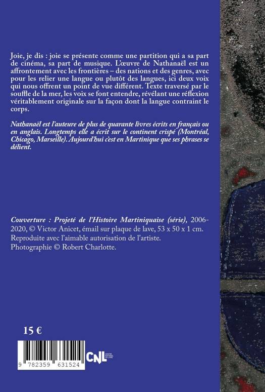 Joie, je dis : joie se présente comme une partition qui a sa part de cinéma, sa part de musique. L'oeuvre de Nathanaël est un affronÂÂteÂment avec les fronÂÂtièÂÂres - des nations et des genres, avec pour les relier une langue ou plutôt des langues, ici deux voix qui nous offre un point de vue différent .Texte traversé par le souffle de la nature et de la mer, plusieurs voix se font entendre révélant une réflexion véritablement originale sur la façon dont la langue contraint le corps. Ce livre, après de nombreuses écritures, toutes appartenant au continent, est totalement investi par la Martinique, sa nature, sa violence. Il traduit dans une écriture profondément charnelle le souffle qui la parcourt. Cette écriture révèle un univers étonnant, traduction, qui va de souffle en souffle, lâchant de son mot le deuil qui le caractérise, retrouvant la vitalité de l'île qui est aussi, démission d'occidents, lieu de mort et de désespoir.