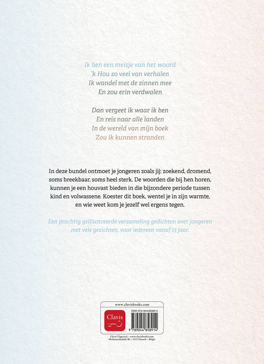 In deze bundel ontmoet je jongeren zoals jij: zoekend, dromend, soms breekbaar, soms heel sterk. De woorden die bij hen horen, kunnen je een houvast bieden in die bijzondere periode tussen kind en volwassene. Koester dit boek, wentel je in zijn warmte, en wie weet kom je jezelf wel ergens tegen.