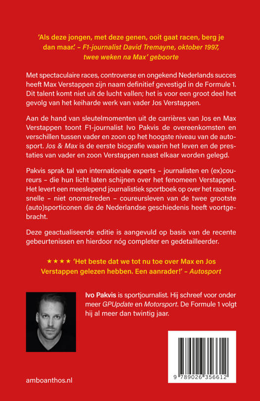 Aan de hand van sleutelmomenten uit de carrières van Jos en Max Verstappen, toont F1-journalist Ivo Pakvis de overeenkomsten en verschillen tussen vader en zoon op het hoogste niveau van de autosport. Jos & Max is hiermee de eerste biografie waarin het leven en de prestaties van vader en zoon Verstappen naast elkaar worden gelegd. Pakvis sprak talloze internationale F1-experts – van journalisten tot (ex-)coureurs – die hun licht laten schijnen op de impact die de naam Verstappen heeft gehad op de Formule 1. Dit maakt Jos & Max een uniek, journalistiek sportboek dat verder gaat dan de soms chauvinistische en opportunistische autosportjournalistiek.
