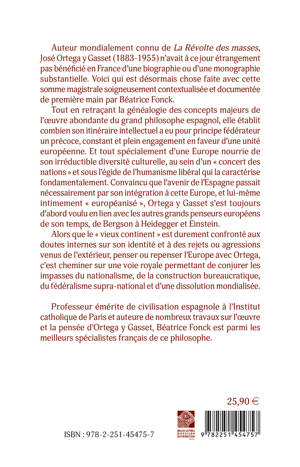 Auteur mondialement connu de La Revolte des masses, Jose Ortega y Gasset (1883-1955) n'avait a ce jour etrangement pas beneficie en France d'une biographie ou d'une monographie substantielle. Voici qui est desormais chose faite avec cette somme magistrale soigneusement contextualisee et documentee de premiere main par Beatrice Fonck. Tout en retracant la genealogie des concepts majeurs de l'oeoeuvre abondante du grand philosophe espagnol, elle etablit combien son itineraire intellectuel a eu pour principe federateur un precoce, constant et plein engagement en faveur d'une unite europeenne. Et tout specialement d'une Europe nourrie de son irreductible diversite culturelle, au sein d'un " concert des nations " et sous l'egide de l'humanisme liberal qui la caracterise fondamentalement. Convaincu que l'avenir de l'Espagne passait necessairement par son integration a cette Europe, et lui-meme intimement " europeanise ", Ortega y Gasset s'est toujours d'abord voulu en lien avec les autres grands penseurs europeens de son temps, de Bergson a Heidegger et Einstein. Alors que le " vieux continent " est durement confronte aux doutes internes sur son identite et a des rejets ou agressions venus de l'exterieur, penser ou repenser l'Europe avec Ortega, c'est cheminer sur une voie royale permettant de conjurer les impasses du nationalisme, de la construction bureaucratique, du federalisme supra-national et d'une dissolution mondialisee.