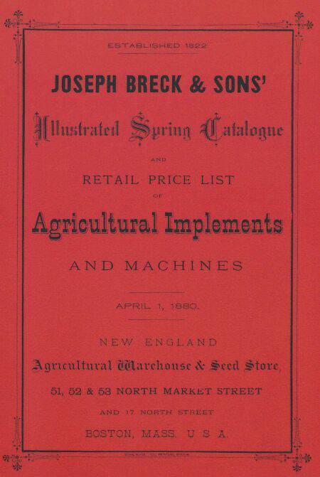 Joseph Breck & Sons was a seed and agricultural implements wholesaler and retailer in Boston, Massachusetts, established in 1822. Its founder was Joseph Breck (1794 1873), a noted early horticulturist and botanist. His early fame stemmed from a book he wrote in 1833, The Young Florist, only the second book on flowers published in America. Breck published his company s first catalogue in 1840, the New England Agricultural Warehouse and Seed Store Catalogue, to promote his company s products. This is a reproduction of the April 1, 1880, Joseph Breck & Sons Illustrated Spring Catalogue and Retail Price List of Agricultural Implements and Machines. High quality illustrations and well written (often entertaining) descriptions make this a highly desirable reproduction. tems include: plows, harrows, planters, cultivators, hoes, mowers, rakes, horse hay forks, rollers, scrapers, wheel barrows, store trucks, churns, butter workers, potato diggers, post hole diggers, graters, grindstones, lawn mowers, cistern and well pumps, lawn fountains, garden engines, hydraulic rams, brass syringes, wringers, ice cream freezers, carriage jacks, copper weather vanes, and many other related items.