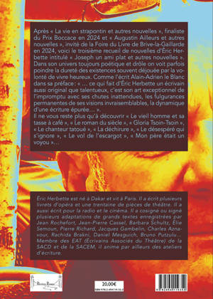 Après « La vie en strapontin et autres nouvelles », finaliste du Prix Boccace en 2024 et « Augustin Ailleurs et autres nouvelles », invité de la Foire du Livre de Brive-la-Gaillarde en 2024, voici le troisième recueil de nouvelles d’Éric Herbette intitulé « Joseph un ami plat et autres nouvelles ». Dans son univers toujours poétique et drôle on voit parfois poindre la dureté des existences souvent déjouée par la volonté de vivre heureux. Comme l’écrit Alain-Adrien le Blanc dans sa préface: « … ce qui fait d’Éric Herbette un écrivain aussi original que talentueux, c’est son art exceptionnel de l’impromptu avec ses chutes inattendues, les fulgurances permanentes de ses visions invraisemblables, la dynamique d’une écriture épurée… ». Il ne vous reste plus qu’à découvrir « Le vieil homme et sa tasse à café », « Le roman du siècle », « Gloria Tsoin-Tsoin », « Le chanteur tatoué », « La déchirure », « Le désespéré qui s’ignore », « Le vol de l’escargot », « Mon père était un voyou »…