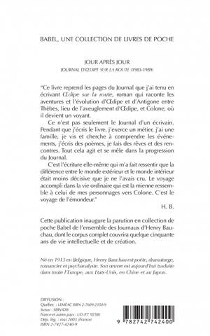 "Ce livre reprend les pages du Journal que j'ai tenu en écrivant oedipe sur la route, roman qui raconte les aventures et l'évolution d'oedipe et d'Antigone entre Thèbes, lieu de l'aveuglement d'oedipe, et Colone, où il devient un voyant. Ce n'est pas seulement le Journal d'un écrivain. Pendant que j'écris le livre, j'exerce un métier, j'ai une famille, je vis et cherche à comprendre les événements, j'écris des poèmes, je fais des rêves et des rencontres. Tout cela agit et se mêle dans la progression du Journal. C'est l'écriture elle-même qui m'a fait ressentir que la différence entre le monde extérieur et le monde intérieur était moins décisive que je ne l'avais cru. Le voyage accompli dans la vie ordinaire qui est la mienne ressemble à celui de mes personnages vers Colone. C'est le voyage de l'émondeur." H. B. Cette publication inaugure la parution en collection de poche Babel de l'ensemble des Journaux d'Henry Bau-chau, dont le corpus complet couvrira quelque cinquante ans de vie intellectuelle et de création.