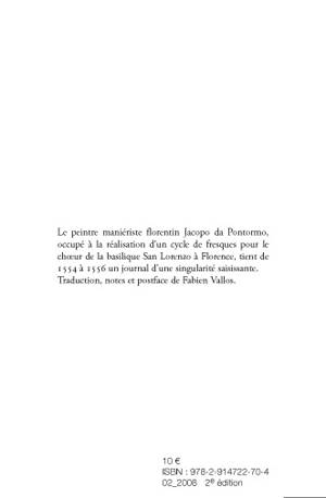 Le peintre maniériste florentin Jacopo da Pontormo, occupé à la réalisation d’un cycle de fresques pour le choeur de la basilique San Lorenzo à Florence, tient de 1554 à 1556 un journal d’une singularité saisissante.
