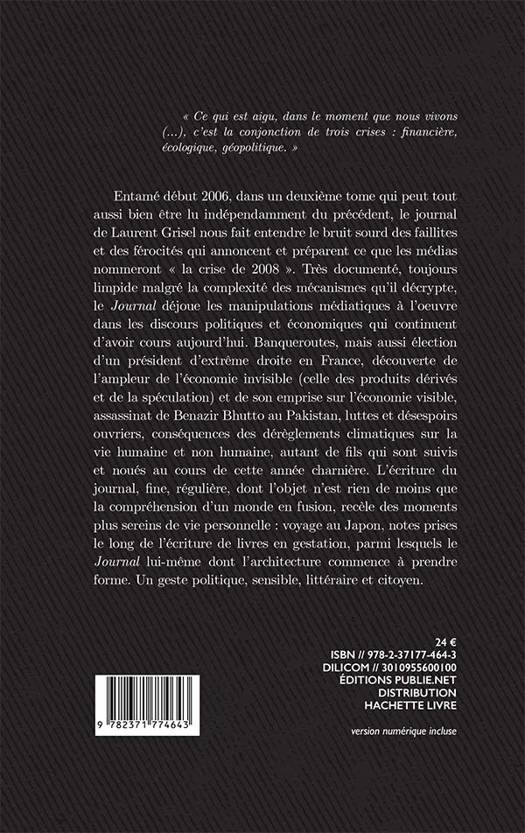 « Ce qui est aigu, dans le moment que nous vivons (...), c’est la conjonction de trois crises : financière, écologique, géopolitique. » Entamé début 2006, dans un deuxième tome qui peut tout aussi bien être lu indépendamment du précédent, le journal de Laurent Grisel nous fait entendre le bruit sourd des faillites et des férocités qui annoncent et préparent ce que les médias nommeront « la crise de 2008 ». Très documenté, toujours limpide malgré la complexité des mécanismes qu'il décrypte, le Journal déjoue les manipulations médiatiques à l'oeuvre dans les discours politiques et économiques qui continuent d'avoir cours aujourd'hui. Banqueroutes, mais aussi élection d'un président d'extrême droite en France, découverte de l'ampleur de l'économie invisible (celle des produits dérivés et de la spéculation) et de son emprise sur l'économie visible, assassinat de Benazir Bhutto au Pakistan, luttes et désespoirs ouvriers, conséquences des dérèglements climatiques sur la vie humaine et non humaine, autant de fils qui sont suivis et noués au cours de cette année charnière. L'écriture du journal, fine, régulière, dont l'objet n'est rien de moins que la compréhension d'un monde en fusion, recèle des moments plus sereins de vie personnelle : voyage au Japon, notes prises le long de l'écriture de livres en gestation, parmi lesquels le Journal lui-même dont l'architecture commence à prendre forme. Un geste politique, sensible, littéraire et citoyen.