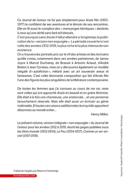 Ce Journal de l'amour ne fut pas simplement pour Anaïs Nin (1903-1977) le confident de ses aventures et le témoin de ses rencontres. Elle en fit aussi le complice des « mensonges héroïques » (l'expression est d'elle) destinés à ceux qu'une vérité sans fard eût blessés.