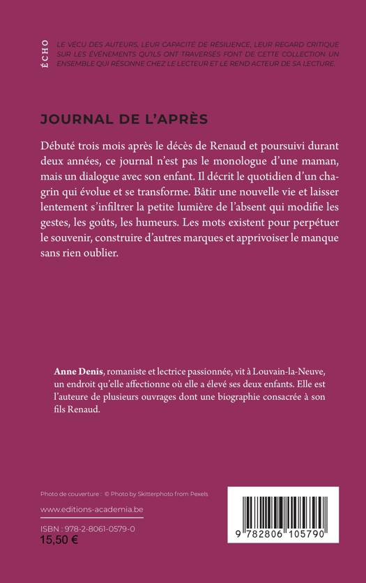 Débuté trois mois après le décès de Renaud et poursuivi durant deux années, ce journal n'est pas le monologue d'une maman, mais un dialogue avec son enfant. Il décrit le quotidien d'un chagrin qui évolue et se transforme. Bâtir une nouvelle vie et laisser lentement s'infiltrer la petite lumière de l'absent modifie les gestes, les goûts, les humeurs. Les mots existent pour perpétuer le souvenir, construire d'autres marques et apprivoiser le manque sans rien oublier.