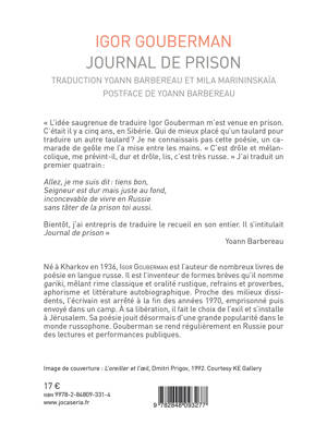 Journal de prison. Le titre n'en fait pas mystère, l'expérience carcérale est le sujet du recueil. Et c'est bien un journal qui est donné au lecteur, sans chronologie, sans grand récit, mais un journal malgré tout, avec ses instantanés, ses vignettes, ses annotations sensibles, ses petits émerveillements, avec les douleurs et les cocasseries du quotidien. On commence par le pressentiment de l'arrestation, on finit par un transfert et un voyage en train, un voyage musical (les dernières pages sont riches de plusieurs références à la chanson populaire), avec pour horizon incertain un camp quelque part en Sibérie.