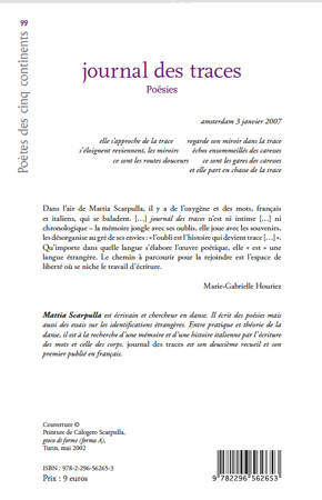 Dans l'air de Mattia Scarpulla, il y a de l'oxygène et des mots, français et italiens, qui se baladent. [...]journal des traces n'est ni intime [...] ni chronologique - la mémoire jongle avec ses oublis, elle joue avec les souvenirs, les désorganise au gré de ses envies : "l'oubli est l'histoire qui devient trace [...]". Qu'importe dans quelle langue s'élabore l'oeuvre poétique, elle "est" une langue étrangère. Le chemin à parcourir pour la rejoindre est l'espace de liberté où se niche le travail d'écriture. Marie-Gabrielle Houriez