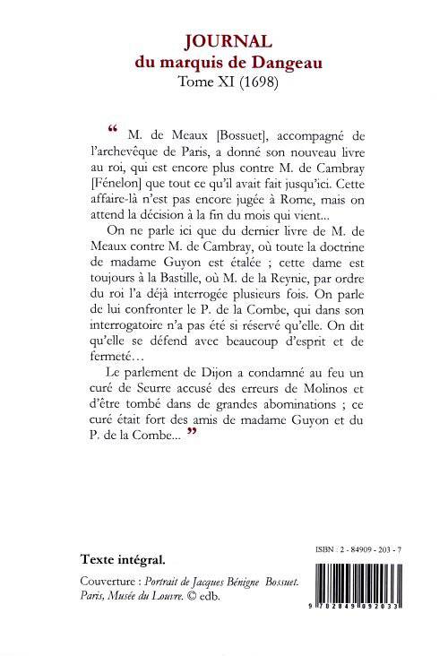 « M. de Meaux [Bossuet], accompagné de l'archevêque de Paris, a donné son nouveau livre au roi, qui est encore plus contre M. de Cambray [Fénelon] que tout ce qu'il avait fait jusqu'ici. Cette affaire-là n'est pas encore jugée à Rome, mais on attend la décision à la fin du mois qui vient...