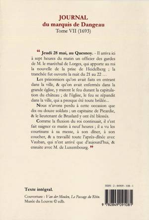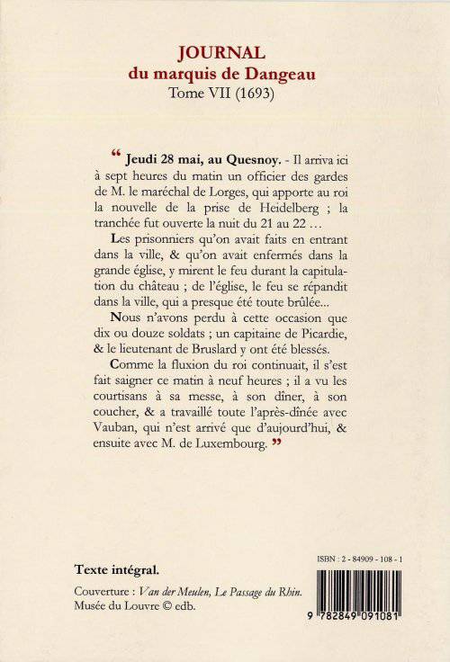 "Jeudi 28 mai, au Quesnoy. - Il arriva ici à sept heures du matin un officier des gardes de M. le maréchal de Lorges, qui apporte au roi la nouvelle de la prise de Heidelberg; la tranchée fut ouverte la nuit du 21 au 22...