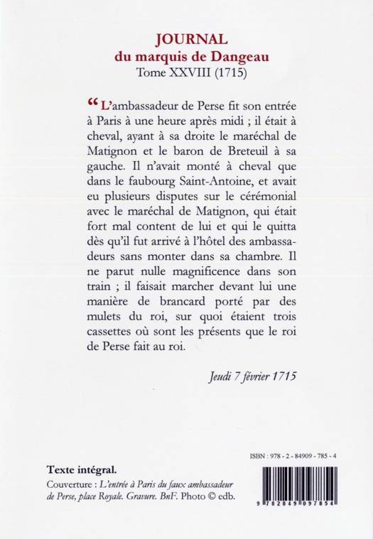 « L'ambassadeur de Perse fit son entrée à Paris à une heure après midi ; il était à cheval, ayant à sa droite le maréchal de Matignon et le baron de Breteuil à sa gauche. Il n'avait monté à cheval que dans le faubourg Saint-Antoine, et avait eu plusieurs disputes sur le cérémonial avec le maréchal de Matignon, qui était fort mal content de lui et qui le quitta dès qu'il fut arrivé à l'hôtel des ambassadeurs sans monter dans sa chambre. Il ne parut nulle magnificence dans son train ; il faisait marcher devant lui une manière de brancard porté par des mulets du roi, sur quoi étaient trois cassettes où sont les présents que le roi de Perse fait au roi.