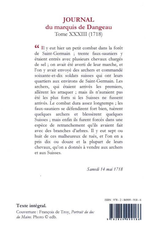 Il y eut hier un petit combat dans la forêt de Saint-Germain ; trente faux-sauniers y étaient entrés avec plusieurs chevaux chargés de sel ; on avait été averti de leur marche, et l'on y avait envoyé des archers et commandé soixante-et-dix soldats suisses qui ont leurs quartiers aux environs de Saint-Germain. Les archers, qui étaient arrivés les premiers, allèrent les attaquer ; mais ils n'auraient pas été les plus forts si les Suisses ne fussent arrivés. Le combat dura assez longtemps ; les faux-sauniers se défendirent fort bien, tuèrent quelques archers et blessèrent quelques Suisses ; mais enfin ils furent forcés dans une espèce de retranchement qu'ils avaient fait avec des branches d'arbres. Il y eut sept ou huit de ces malheureux de tués, et l'on en a pris dix ou douze et la plupart de leurs chevaux, qu'on a donnés à vendre aux archers et aux Suisses.
