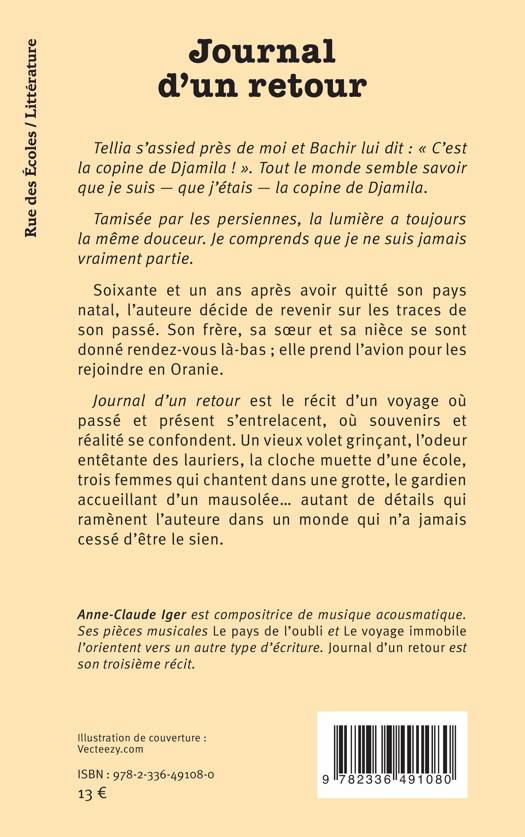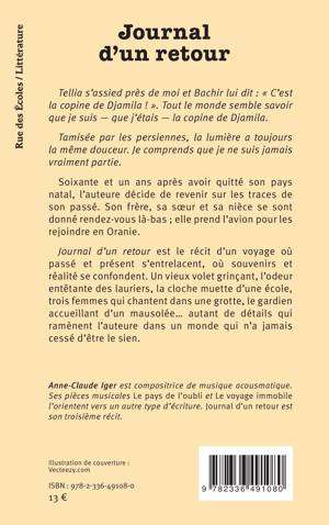 Soixante et un ans après avoir quitté son pays natal, l’auteure décide de revenir sur les traces de son passé. Son frère, sa sœur et sa nièce se sont donné rendez-vous là-bas ; elle prend l’avion pour les rejoindre en Oranie. Journal d’un retour est le récit d’un voyage où passé et présent s’entrelacent, où souvenirs et réalité se confondent. Un vieux volet grinçant, l’odeur entêtante des lauriers, la cloche muette d’une école, trois femmes qui chantent dans une grotte, le gardien accueillant d’un mausolée… autant de détails qui ramènent l’auteure dans un monde qui n’a jamais cessé d’être le sien.
