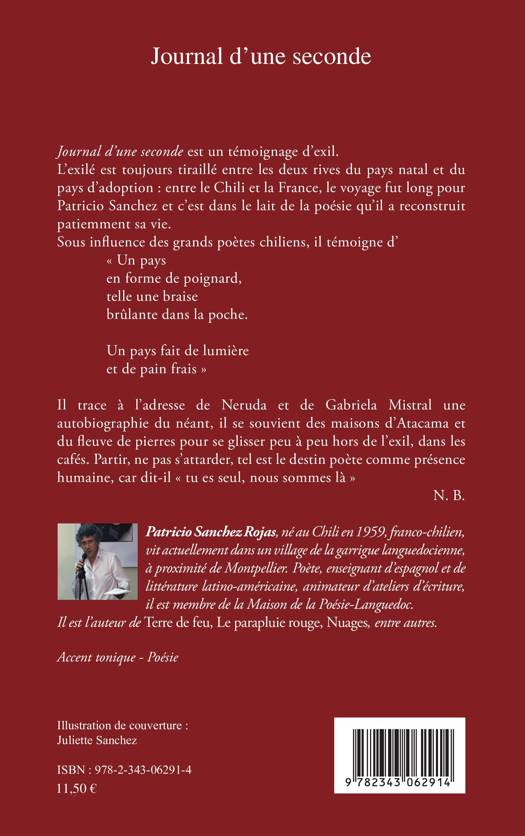 Journal d'une seconde est un témoignage d'exil. L'éxilé est toujours tiraillé entre les deux rives du pays natal et du pays d'adoption : entre le Chili et la France, le voyage fut long pour Patrico Sanchez et c'est dans le lait de la poésie qu'il a reconstruit patiemment sa vie.