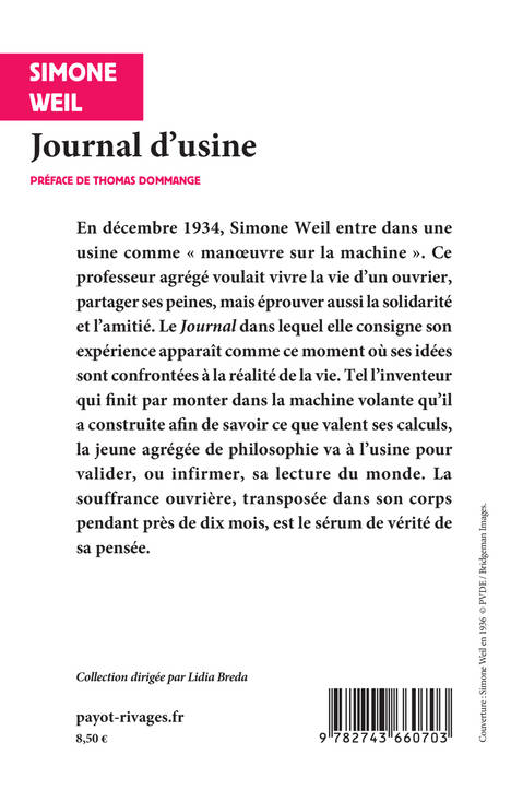 Simone Weil considère son année d'usine comme la plus décisive de sa vie et de sa pensée. L'intérêt de son Journal, écrit cette même année, est donc de nous renseigner sur la nature de ce bouleversement physique et intellectuel. Il n'exhibe pas ses premières réponses aux problèmes politiques et théoriques posés par l'année d'usine, il montre ce qui est en deçà de la philosophie et qui la réclame, exhibe ce contre quoi l'écriture à venir devra lutter, quel silence elle combat, et en quoi ce silence est peut-être le nôtre.