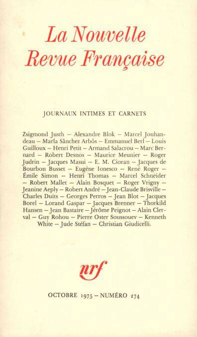 Zsigmond Justh, Journal : époque parisienne Alexandre Blok, Journal 1911-1912 Marcel Jouhandeau, Adieu à Chaminadour María Sánchez Arbós, Journal d'une institutrice Emmanuel Berl, Sur le 'Journal intime' Louis Guilloux, Journal Henri Petit, Bribes d'un Journal de pensée Armand Salacrou, Journal de Courval Marc Bernard, Notes Robert Desnos, Journal 1944 Maurice Meunier, Pages de Journal Roger Judrin, Jardin fermé Jacques Masui, Journal Cioran, Fluctuations Jacques de Bourbon Busset, Journal Eugène Ionesco, Journal d'un citoyen malgré lui René Roger, Poussières de moi-même Émile Simon, Journal Henri Thomas, Il n'y a pas de journal intime - Été, Paris Marcel Schneider, Journal intime de janvier 1968 Robert Mallet, Journal Alain Bosquet, Journal public Roger Vrigny, Accidents de parcours Janine Aeply, Pages de Journal Robert André, Pages de carnets Jean-Claude Brisville, Journal Charles Duits, Notes Georges Perros, Feuilles mortes Jean Blot, Ni Kali mera, ni hora Kali Jacques Borel, Journal Lorand Gaspar, Journal de Jérusalem Jacques Brenner, Échantillons 67-68 Thorkild Hansen, Journal 1945 Jean Bastaire, Croire au printemps Jérôme Peignot, Journal Alain Clerval, Les limites du Journal intime Guy Rohou, Le contrecœur Pierre Oster, Paysage du Tout Kenneth White, Le Désert de Gobi Jude Stéfan, Faux Journal Christian Giudicelli, L'adieu du père