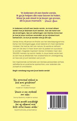 'In iedereen zit een beste versie. Ik ga je helpen die naar boven te halen. Waar je ook staat in je leven: ga ervoor, dit is jouw moment.' - Denise Anna In iedereen schuilt een beste versie. Je moet alleen weten hoe je daaraan kunt werken. Aan de hand van de ervaringen, tips en oefeningen van Denise Anna leer je hoe je jouw routines verandert en je mindset kunt beheersen. Zo kun je worden wie je wilt zijn. * voor iedereen die zichzelf wil ontwikkelen * een prikkelende combinatie van Denise persoonlijke verhaal, zelfreflectie en praktische opdrachten * Denise Anna inspireert dagelijks 355.000 mensen op social media