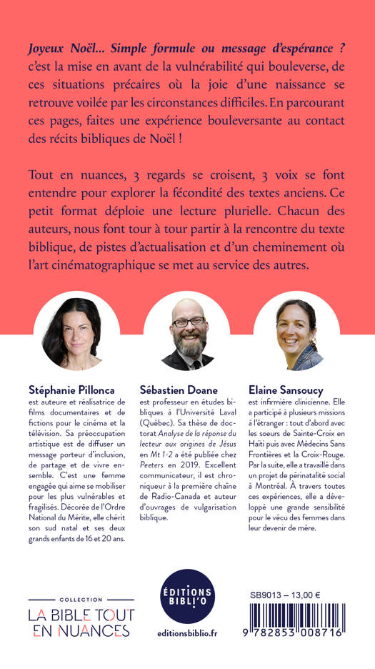 Ce petit format déploie une lecture plurielle. Tout en nuances, 3 regards se croisent, 3 voix se font entendre pour explorer la fécondité des textes anciens. Chacun des auteurs, nous font tour à tour partir à la rencontre du texte biblique, de pistes d’actualisation et d’un cheminement où l’art cinématographique se met au service des autres. Joyeux Noël ?, c’est la mise en avant de la vulnérabilité qui bouleverse, de ces situations précaires où la joie d’une naissance se retrouve voilée par les circonstances difficiles. En parcourant ces pages, faites une expérience bouleversante au contact des récits bibliques de Noël ! À propos de Cyprien Comte : Cyprien Comte, prêtre catholique, enseigne la Bible à l'Institut catholique de Toulouse. Il aime faire connaître les travaux de ses collègues. Il se réjouit de collaborer à cette collection œcuménique pour favoriser un échange profond et sincère entre ceux qui lisent la Bible, ceux qu'elle interpelle et ceux qui ne la connaissent pas. À propos des auteurs : Stéphanie Pillonca est auteure et réalisatrice de films documentaires et de fictions pour le cinéma et la télévision. Sa préoccupation artistique est de diffuser un message porteur d’inclusion, de partage et de vivre ensemble... Stephanie Pillonca est une femme engagée, qui aime se mobiliser pour les plus vulnérables et fragilisés. Elle a été décorée de l’Ordre National du Mérite, chérit son sud natal, et ses deux grands enfants de 16 et 20 ans... Sébastien Doane est professeur en études bibliques à l’Université Laval (Québec). Sa thèse de doctorat Analyse de la réponse du lecteur aux origines de Jésus en Mt 1-2 a été publiée chez Peeters en 2019. Excellent communicateur, il est chroniqueur à la première chaîne de Radio-Canada et auteur d’ouvrages de vulgarisation biblique. Elaine Sansoucy est infirmière clinicienne. Elle a participé à plusieurs missions à l’étranger : tout d’abord avec les sœurs de Sainte-Croix en Haïti et ensuite avec Médecins Sans Frontières et la Croix-Rouge. Par la suite, elle a travaillé dans un projet de périnatalité social à Montréal. À travers toutes ces expériences, elle a développé une grande sensibilité pour le vécu des femmes dans leur devenir de mère.
