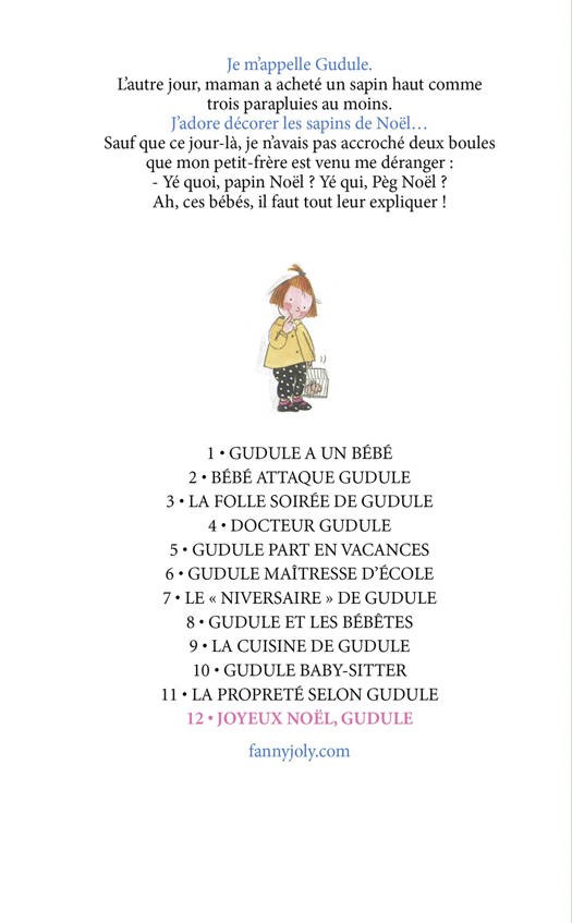 Je m’appelle Gudule. L’autre jour, maman a acheté un sapin haut comme trois parapluies au moins. J’adore décorer les sapins de Noël... Sauf que ce jour-là, je n’avais pas accroché deux boules que mon petit-frère est venu me déranger : - Yé quoi, papin Noël ? Yé qui, Pèg Noël ? Ah, ces bébés, il faut tout leur expliquer !