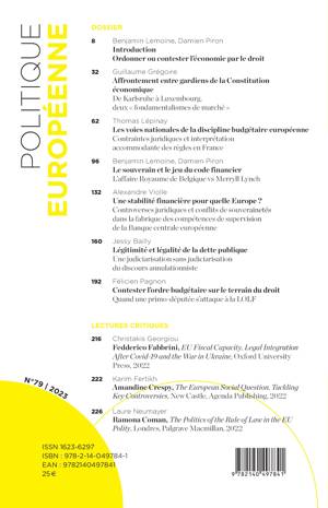 Au sommaire de ce numéro : Introduction. Ordonner ou contester l’économie par le droit / Affrontement entre gardiens de la Constitution économique. De Karlsruhe à Luxembourg, deux « fondamentalismes de marché » / Les voies nationales de la discipline budgétaire européenne. Contraintes juridiques et interprétation accommodante des règles en France / Le souverain et le jeu du code financier. L’affaire Royaume de Belgique vs Merryll Lynch / Une stabilité financière pour quelle Europe ? Controverses juridiques et conflits de souverainetés dans la fabrique des compétences de supervision de la Banque centrale européenne / Légitimité et légalité de la dette publique. Une judiciarisation sans judiciarisation du discours annulationniste / Contester l’ordre budgétaire sur le terrain du droit. Quand une primo-députée s’attaque à la LOLF
