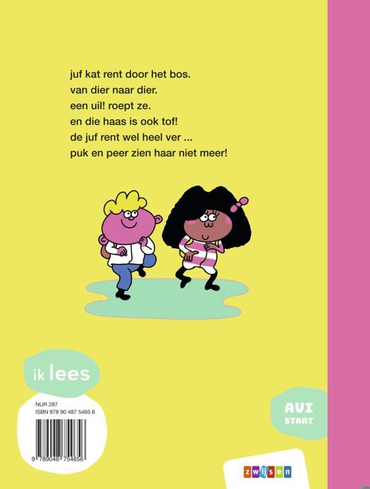 In dit verhaal doen niet de kinderen stoute dingen, maar loopt de juf steeds weg. De altijd gehaaste, over-actieve en over-enthousiaste juf kat rent als een dolle door het bos. Onderweg komt ze heel veel dieren tegen. En dan... lijkt ze ineens verdwenen te zijn.