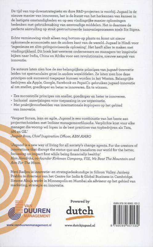 De tijd van top-downstrategieën, dure R&D-projecten en strak gestructureerde innovatieprocessen is voorbij. Echte vernieuwing vindt alleen nog bottom-up plaats en komt uit nieuw opkomende economieën aan de andere kant van de wereld. 'Jugaad' is Hindi voor 'ingenieuze en slim geïmproviseerde oplossing'. Dit boek laat westerse ondernemers en managers ter inspiratie kijken naar India, China en Afrika voor een revolutionaire, nieuwe aanpak van innovatie. De auteurs onderscheiden en analyseren daarbij de zes belangrijkste principes van Jugaad-innovatie. Ze laten zien waarom Jugaad leidt tot spectaculaire groei in andere werelddelen; en hoe deze principes ook succesvol toegepast kunnen worden in het Westen. Belangrijke bedrijven als Apple, Google, Facebook en PepsiCo gebruiken Jugaad-innovatie al om sneller, goedkoper en beter te innoveren. En te winnen. - Zes succesvolle principes om sneller, goedkoper en beter te innoveren. - Inclusief aanwijzingen voor toepassing in uw organisatie. - Met praktijkvoorbeelden van internationale koplopers op het gebied van innovatie.