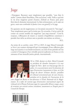 "Témoigner. Raconter aussi simplement que possible, "sans faire le malin" comme disait Pouchkine. Dire au lecteur : voilà. Voilà ce qu'était la vie d'un magistrat parmi d'autres, d'abord en France puis pour finir dans le domaine international. Le faire sérieusement, car le sujet est grave, mais sans confondre la Justice (avec un grand J) et le juge. En quarante ans de magistrature, je n'ai jamais rencontré le "bon juge". Tout simplement parce qu'il n'existe pas. En revanche, il m'est arrivé de croiser un certain nombre de magitrats "pas trop mauvais". Ceux-là, toujours, s'efforçaient de réussir ce numéro d'équilibriste consistant à prendre leur tâche au sérieux sans se prendre eux-mêmes au sérieux." M.L. Au terme de sa carrière, entre 1975 et 2015, le juge Marcel Lemonde se livre à un examen rétrospectif qui s'accompagne d'une réflexion plus large sur la justice et ses bouleversements, au cours d'une période où l'on a assisté à l'émergence d'un véritable pouvoir judiciaire en France et à la naissance d'une nouvelle justice pénale internationale.