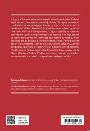 « Juger », en français, est un verbe au profil sémantique singulier. D’abord, explicitement, il renvoie au domaine judiciaire : l’usage actuel du mot confirme son sens étymologique. Ensuite, tout aussi clairement, mais de manière plus diffuse, il renvoie à de multiples autres sphères, qui n’ont rien à avoir avec l’institution judiciaire. « Juger » est donc un verbe qui possède une signification juridique précise couplée à un large spectre de significations autres. Or, ce sont ces deux aspects du verbe qu’il faut connaître afin de pouvoir, le jour du concours, en jouer pour peut-être soulever un problème, sans doute proposer une solution. Aider les candidats à apprendre à jongler avec les différents sens et domaines d’application de l’acte de juger, telle est l’ambition de cet ouvrage qui, de Platon à Ricoeur, d’Eschyle à Tolkien, propose un parcours original dans le corpus requis pour mieux comprendre ce que juger veut dire.