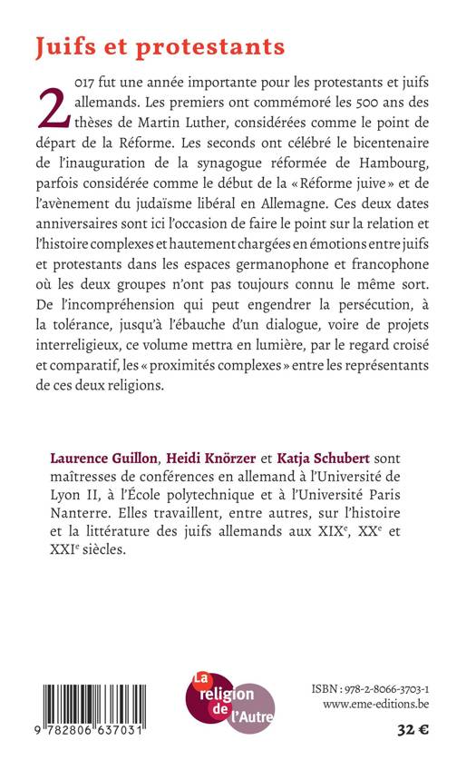 En 2017, les protestants ont commémoré les 500 ans des thèses de Martin Luther, considérées comme le point de départ de la Réforme. Quant aux juifs allemands, ils ont célébré le bicentenaire de l'inauguration de la synagogue réformée de Hambourg, parfois considérée comme le début de la « Réforme juive ». Ces deux dates anniversaires sont l'occasion, dans ce volume, de faire le point sur la relation et l'histoire complexes et hautement chargées en émotions entre juifs et protestants dans les espaces germanophone et francophone.
