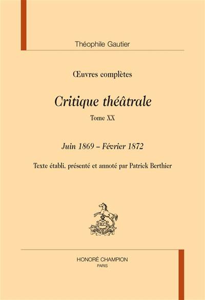 Texte intégral et annoté de la critique dramatique tenue par l'écrivain entre juin 1869 et février 1872, période marquée par la fatigue et par la guerre. 1872 marque la fin de la carrière de feuilletoniste de Théophile Gautier, notamment avec 17 articles donnés à La Gazette de Paris.