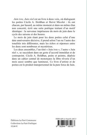Juin ivre, Juin réel est un livre à deux voix, où dialoguent les poètes Cécile A. Holdban et Hervé Micolet : ils ont chacun, par hasard, au même moment et dans un même élan non concerté, écrit une suite poétique traitant d’un motif identique : la survenue impétueuse du mois de juin dans le cycle des saisons et des heures. Le mois de juin étant pour les deux poètes celui d’une date anniversaire décisive, il prend selon l’un ou l’autre des tonalités très différentes, mais les échos et réponses entre les deux sont nombreux et mystérieux. Les deux ensembles, l’un titré « Juin ivre», l’autre « Juin réel», se succèdent dans un geste d’accord immédiat et de contrepoint. Cécile A. Holdban, poète et peintre, déploie dans un cahier central de monotypes la libre rêverie d’un mois aussi sombre que lumineux. Livre d’artiste et de poètes, Juin ivre, Juin réel est le produit transpersonnel de la pure force de Juin.
