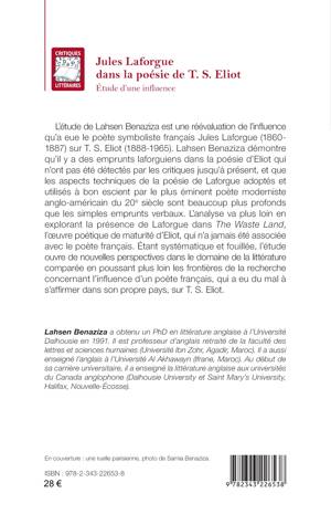 La présente étude étude révèle l'influence qu'a eue le poète symboliste français Jules Laforgue (1860-1887) sur T. S. Eliot (1888-1965). Lahsen Benaziza démontre qu'il y a des emprunts laforguiens dans la poésie d'Eliot qui n'ont pas été détectés par les critiques jusqu'à présent, et que les aspects techniques de la poésie de Laforgue adoptés et utilisés à bon escient par le plus éminent poète moderniste anglo-américain du 20e siècle sont beaucoup plus profonds que les simples emprunts verbaux. L'analyse va plus loin en explorant la présence de Laforgue dans The Waste Land, l'oeuvre poétique de maturité d'Eliot, qui n'a jamais été associée avec le poète français. Étant systématique et fouillée, l'étude ouvre de nouvelles perspectives dans le domaine de la littérature comparée en poussant plus loin les frontières de la recherche concernant l'influence d'un poète français, qui a eu du mal à s'affirmer dans son propre pays, sur T. S. Eliot.