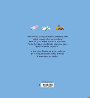 Jules aimerait bien jouer avec sa petite soeur Léa. Mais à chaque fois, il s'y prend mal et se fait gronder par Maman et Mamoune. Pas évident pour un enfant de trouver sa place quand la famille s'agrandit... Un livre plein de douceur et de tendresse pour évoquer les liens parfois difficiles à nouer dans les fratries.