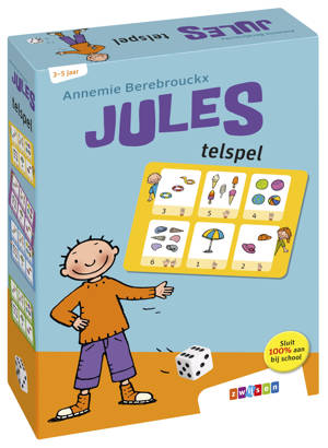 Spelenderwijs leren tellen is een feest met dit Jules spel! Kinderen gooien om de beurt met de dobbelsteen, tellen het aantal ogen en pakken een dobbelsteenfiche met hetzelfde aantal ogen. Ze kunnen de cijfers herkennen óf de vingers óf de plaatjes tellen. Het spel kan zo op verschillende niveaus gespeeld worden en is geschikt voor kinderen die leren tellen en voor kinderen die al kunnen tellen. Wie als eerste alle vakjes van het speelbord heeft bedekt met fiches, is de winnaar.