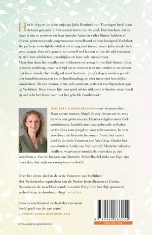 Het is 1839 en de achttienjarige Julia Bentinck van Thoringen heeft haar debuut gemaakt in het sociale leven van de adel. Dat betekent dat ze klaar is om te trouwen en haar moeder Anna en vader Simon hebben al diverse geïnteresseerde jongemannen verwelkomd op hun landgoed Vechtlust. De perfecte huwelijkskandidaat zit er nog niet tussen, maar Julia maakt zich geen zorgen. Een echtgenoot zal vanzelf wel komen en tot die tijd vermaakt ze zich met schilderen, paardrijden en haar vele vriendinnen.
