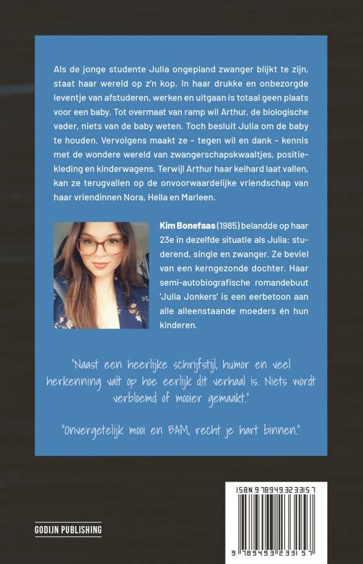 Kim Bonefaas (1985) belandde op haar 23e in dezelfde situatie als Julia: studerend, single en zwanger. Ze beviel van een kerngezonde dochter. Haar semi-autobiografische romandebuut 'Julia Jonkers' is een eerbetoon aan alle alleenstaande moeders én hun kinderen. Ook hoopt Kim met haar boek alle single (aanstaande) moeders een hart onder de riem te steken.
