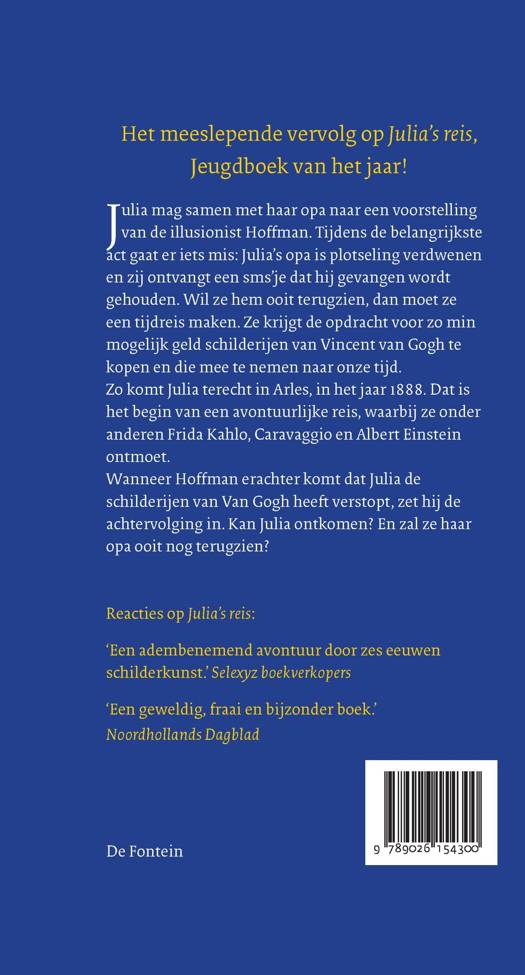 Julia s opa heeft een verrassing voor haar. Hij neemt Julia mee naar een voorstelling van de illusionist Hoffman. De belangrijkste act is het laten verdwijnen en terugkomen van twee tijgers, maar tijdens de voorstelling gaat er iets mis: slechts één van de tijgers keert terug en Julia s opa is plotseling verdwenen. Julia ontvangt een sms je dat haar opa gevangen wordt gehouden. Wil ze hem ooit nog terugzien, dan moet ze een tijdreis maken. Ze krijgt de opdracht zo goedkoop mogelijk schilderijen van Vincent van Gogh te bemachtigen en mee te nemen naar onze tijd. En zo wordt Julia naar Arles in 1888 gestuurd. Ze zoekt vier schilderijen uit, maar verstopt de kunstwerken. Dat is het begin van een avontuurlijke reis, waarbij ze onder anderen Robinson Crusoe, Frida Kahlo, Caravaggio en Albert Einstein ontmoet.Wanneer Hoffman erachter komt dat Julia de schilderijen heeft verstopt, zet hij de achtervolging in. Kan Julia met de schilderijen ontkomen? En zal ze haar opa ooit nog terugzien?