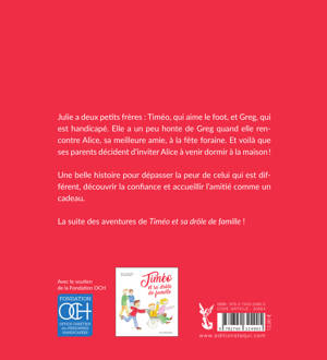 Julie, 10 ans, a deux petits frères : Timéo, qui aime le foot, et Greg, qui est handicapé. Elle a un peu honte de lui quand elle rencontre, à la fête foraine, Alice, sa meilleure amie. Et voilà que ses parents décident d’inviter Alice à venir dormir à la maison ! Chaque événement vécu par l’héroïne de l’histoire, Julie, permet à l’enfant de s’exprimer sur ses propres émotions et sur son vécu : l’impression de ne pas avoir une famille modèle, la peur de l’avenir, mais aussi la joie, la générosité, les bons moments et l’assurance de pouvoir compter sur l’entourage. Une belle histoire pour dépasser la peur de celui qui est différent, découvrir la confiance et accueillir l’amitié comme un cadeau. Ce livre pour les enfants à partir de 7 ans vient compléter Timéo et sa drôle de famille.