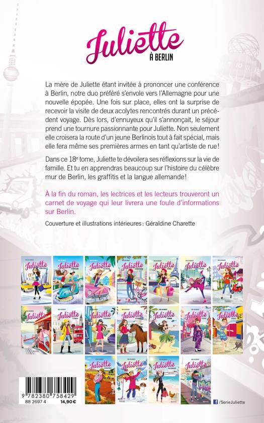 La mère de Juliette étant invitée à prononcer une conférence à Berlin, notre duo mère-fille s'envole vers l'Allemagne pour une nouvelle épopée. Une fois nos héroïnes sur place, deux amis rencontrés lors d'un voyage précédent viennent les surprendre. Pour Juliette, ce qui s'annonçait au départ comme un voyage ennuyeux prend alors une tournure tout à fait excitante. De plus, elle rencontrera un jeune Berlinois prénommé Frantz avec qui elle fera ses premières armes en tant qu'artiste de rue! Les thèmes au menu de ce 18e tome : les barrières de la communication, la vie (et les conflits) dans une famille atypique, l'histoire du fameux mur de Berlin, l'art urbain et l'expression de soi. Surtout, il sera question de graffitis, beaucoup de graffitis. Les jeunes lecteurs se familiariseront aussi avec la langue et la culture allemandes.