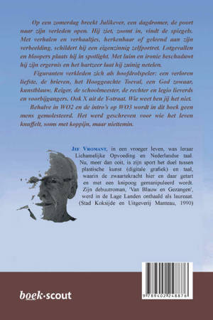 Op een zomerdag breekt Julikever, een dagdromer, de poort naar zijn verleden open. Hij ziet, zoomt in, vindt de spiegels. Met verhalen en verhaaltjes, herkenbaar of geleend aan zijn verbeelding, schildert hij een eigenzinnig zelfportret. Lotgevallen en bloopers plaats hij in spotlight. Met luim en ironie beschaduwt hij zijn ergernis en het hartzeer laat hij zuinig netelen.Figuranten verkleden zich als hoofdrolspeler: een verloren liefste, de brieven, het Hooggeachte Toeval, een God zowaar, kunstblauw, Reiger, de schoolmeester, de rechter en legio lieverds en voorbijgangers. Ook X uit de Y-straat. Wie weet ben jij het niet.Behalve in WO2 en de intro’s op WO3 wordt in dit boek geen mens gemolesteerd. Het werd geschreven voor wie het leven knuffelt, soms met koppijn, maar niettemin.