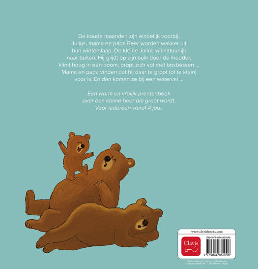 De koude maanden zijn eindelijk voorbij. Julius, mama en papa Beer worden wakker uit hun winterslaap. De kleine Julius wil natuurlijk naar buiten. Hij glijdt op zijn buik door de modder, klimt hoog in een boom, propt zich vol met bosbessen … Mama en papa vinden dat hij daar te groot (of te klein) voor is. En dan komen ze bij een waterval …