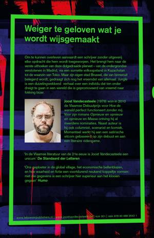 Om te kunnen overleven aanvaardt een schrijver zonder uitgeverij elke opdracht die hem wordt toegeworpen. Het brengt hem naar de verste uithoeken van deze dolgedraaide planeet - van de ondergrondse verstotenen in Madrid, via een surreële volksopstand in Kazachstan tot de waanzin van Tokio. Maar zijn eigen stad Brussel, die van binnenuit belegerd wordt, gedraagt zich nog het vreemdst van allemaal. Jungle is een duizelingwekkend verhaal over een individu dat ten onder dreigt te gaan in een wereld die is gepromoveerd van vreemd naar fokking bizar.