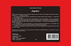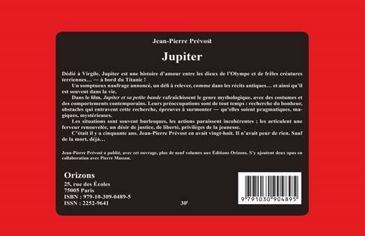 Dédié à Virgile, Jupiter est une histoire d’amour entre les dieux de l’Olympe et de frêles créatures terriennes…― à bord du Titanic ! Un somptueux naufrage annoncé, un défi à relever, comme dans les récits antiques… Dans le film, Jupiter et sa petite bande rafraîchissent le genre mythologique, avec des costumes et des comportements contemporains. Leurs préoccupations sont de tout temps : recherche du bonheur, obstacles qui entravent cette recherche, épreuves à surmonter ― qu’elles soient pragmatiques, magiques, mystérieuses. Les situations sont souvent burlesques, les actions paraissent incohérentes ; les articulent une ferveur renouvelée, un désir de justice, de liberté, privilèges de la jeunesse. C’était il y a cinquante ans. Jean-Pierre Prévost en avait vingt-huit.