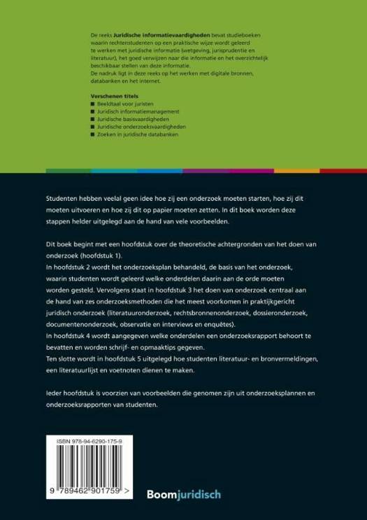 Dit boek begint met een hoofdstuk over de theoretische achtergronden van het doen van onderzoek (hoofdstuk 1). In hoofdstuk 2 wordt het onderzoeksplan behandeld, de basis van het onderzoek, waarin studenten wordt geleerd welke onderdelen daarin aan de orde moeten worden gesteld. Vervolgens staat in hoofdstuk 3 het doen van onderzoek centraal aan de hand van de drie onderzoeksmethoden die het meest voorkomen in juridisch onderzoek (literatuuronderzoek, bronnenonderzoek en het afnemen van interviews en enquêtes). In hoofdstuk 4 wordt aangegeven welke onderdelen een onderzoeksrapport behoort te bevatten en worden schrijf- en opmaaktips gegeven. Ten slotte wordt in hoofdstuk 5 uitgelegd hoe studenten literatuur- en bronvermeldingen, een literatuurlijst en voetnoten dienen te maken.