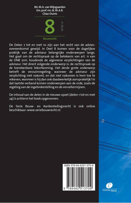 De Delen 7 tot en met 10 zijn aan het recht van de adviesovereenkomst gewijd. In Deel 8 komen voor de dagelijkse praktijk van de adviseur belangrijke onderwerpen langs. Het gaat om de rechtspraak op de betekenis van art. 11 van de DNR 2011, houdende de algemene verplichtingen van de adviseur. Het direct volgende onderwerp is: de rechtspraak op de toerekenbare tekortkoming. Het derde grote onderwerp betreft de verzuimregeling: wanneer de adviseur zijn verplichting niet nakomt, en dat niet nakomen is hem toe te rekenen, wanneer is hij dan ook daadwerkelijk aansprakelijk? In dat laatste verband komen onderwerpen aan de orde, zoals de regeling van de ingebrekestelling en de vervaltermijnen.