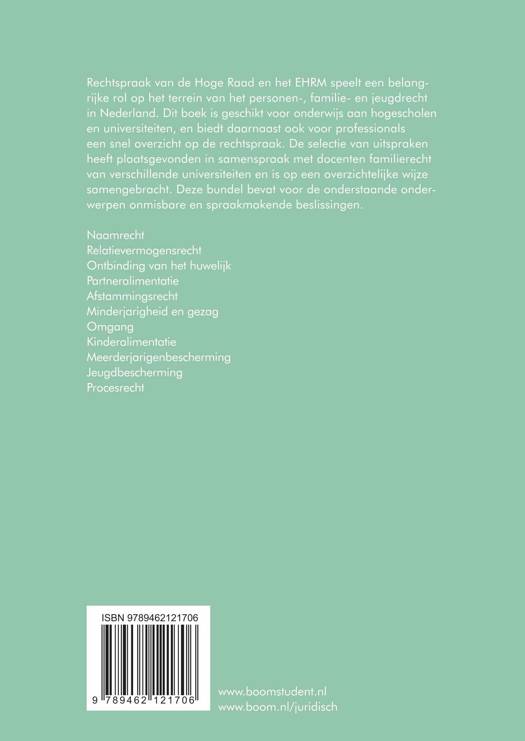 Rechtspraak van de Hoge Raad en het EHRM speelt een belangrijke rol op het terrein van het personen-, familie- en jeugdrecht in Nederland. Dit boek is geschikt voor onderwijs aan hogescholen en universiteiten, en biedt daarnaast ook voor professionals een snel overzicht op de rechtspraak. De selectie van uitspraken heeft plaatsgevonden in samenspraak met docenten familierecht van verschillende universiteiten en is op een overzichtelijke wijze samengebracht. Deze bundel bevat voor de onderstaande onderwerpen onmisbare en spraakmakende beslissingen. Naamrecht Relatievermogensrecht Ontbinding van het huwelijk Partneralimentatie Afstammingsrecht Minderjarigheid en gezag Omgang Kinderalimentatie Meerderjarigenbescherming Jeugdbescherming Procesrecht.