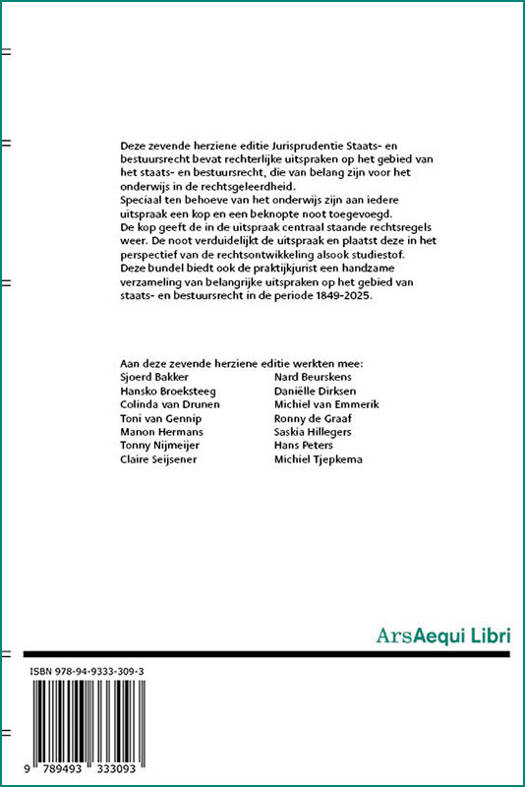 Deze zevende herziene editie Jurisprudentie Staats- en bestuursrecht bevat rechterlijke uitspraken op het gebied van het staats- en bestuursrecht, die van belang zijn voor het onderwijs in de rechtsgeleerdheid. Speciaal ten behoeve van het onderwijs zijn aan iedere uitspraak een kop en een beknopte noot toegevoegd. De kop geeft de in de uitspraak centraal staande rechtsregels weer. De noot verduidelijkt de uitspraak en plaatst deze in het perspectief van de rechtsontwikkeling alsook studiestof. Deze bundel biedt ook de praktijkjurist een handzame verzameling van belangrijke uitspraken op het gebied van staats- en bestuursrecht in de periode 1849-2025.
