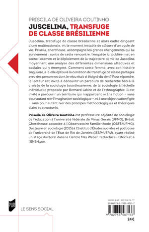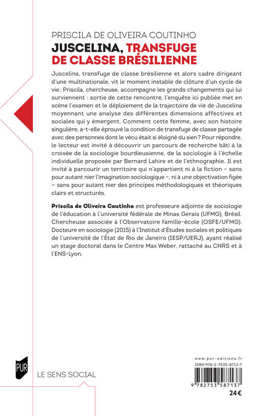 Juscelina, transfuge de classe brésilienne et alors cadre dirigeant d’une multinationale, vit le moment instable de clôture d’un cycle de vie ; Priscila, chercheuse, accompagne les grands changements qui lui surviennent : sortie de cette rencontre, l’enquête ici publiée met en scène l’examen et le déploiement de la trajectoire de vie de Juscelina moyennant une analyse des différentes dimensions affectives et sociales qui y émergent. Comment cette femme, avec son histoire singulière, a-t-elle éprouvé la condition de transfuge de classe partagée avec des personnes dont le vécu était si éloigné du sien ? Pour répondre, le lecteur est invité à découvrir un parcours de recherche bâti à la croisée de la sociologie bourdieusienne, de la sociologie à l’échelle individuelle proposée par Bernard Lahire et de l’ethnographie. Il est invité à parcourir un territoire qui n’appartient ni à la fiction – sans pour autant nier l’imagination sociologique –, ni à une objectivation figée – sans pour autant nier des principes méthodologiques et théoriques clairs et structurés.